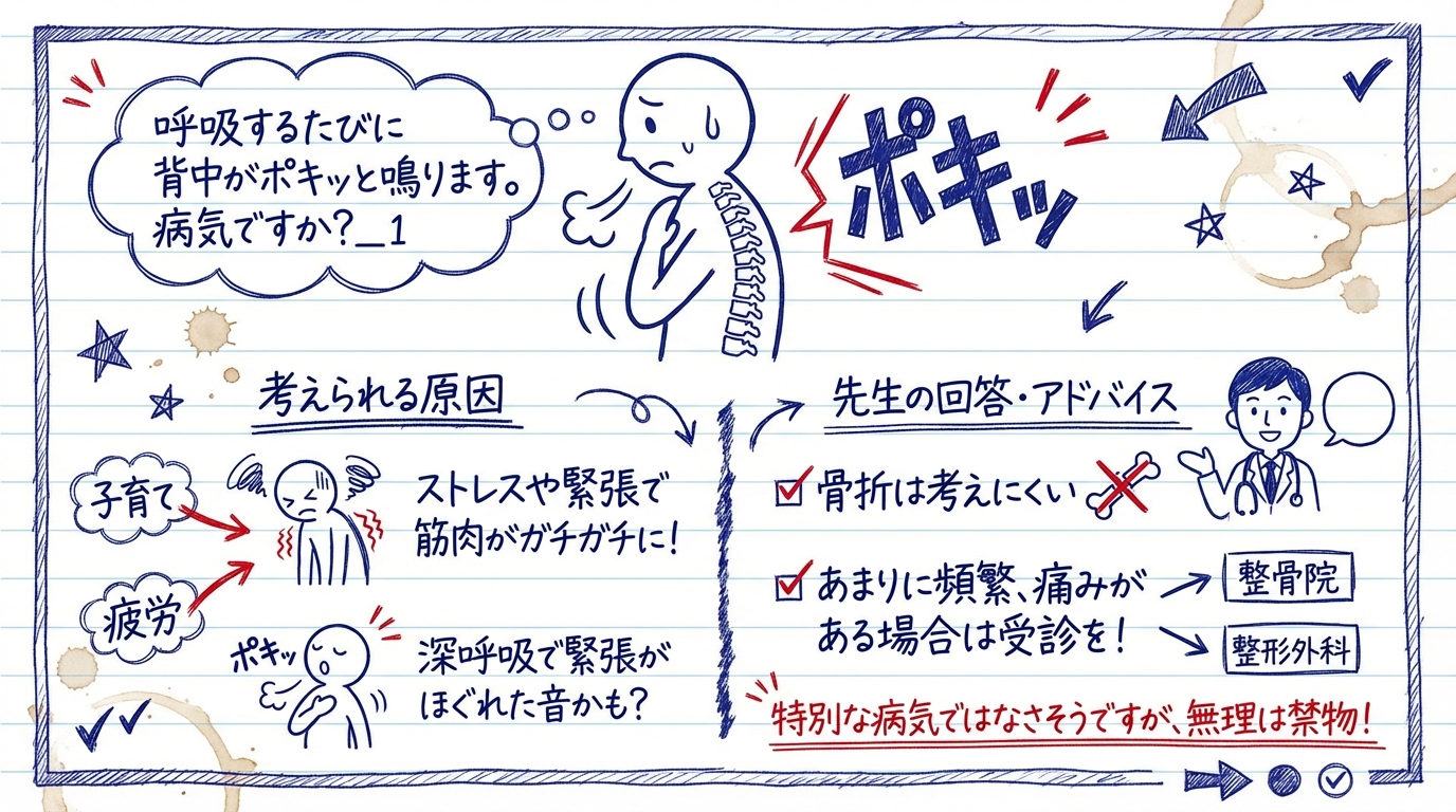 深呼吸で背中がポキッと鳴るのは、ストレスや緊張から筋肉が固くなっているサインである可能性が高いです。病気や骨折の可能性は低いですが、痛みが出てきたり繰り返す場合は専門家への相談を検討してください。